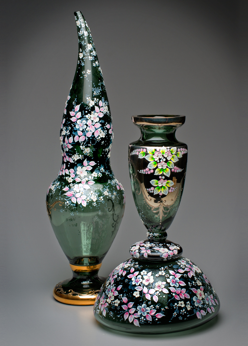 the highly repetitive enamel technique which he employs to decorate another grouping of glass vessels,